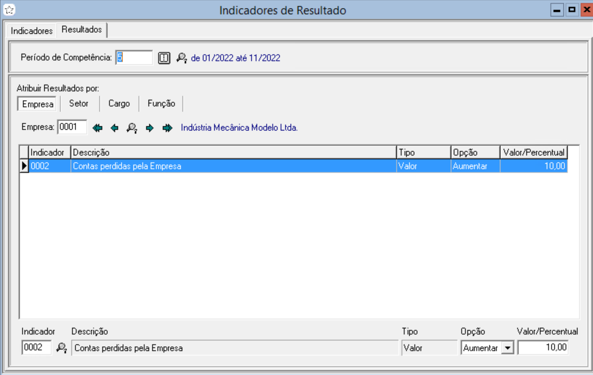 Na guia Resultados, informe o percentual ou valor do Indicador no período. O indicador pode ser vinculado para a Empresa, os Cargos ou as Funções.