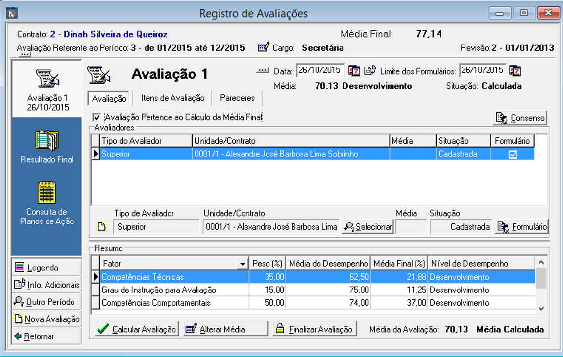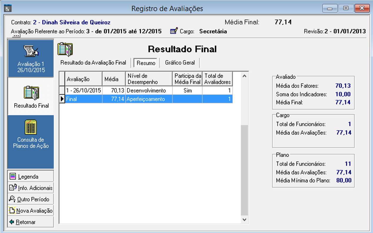 Após, registre os dados do período para o colaborador, através do menu: Cadastramento > Resultado dos Valores Individuais.