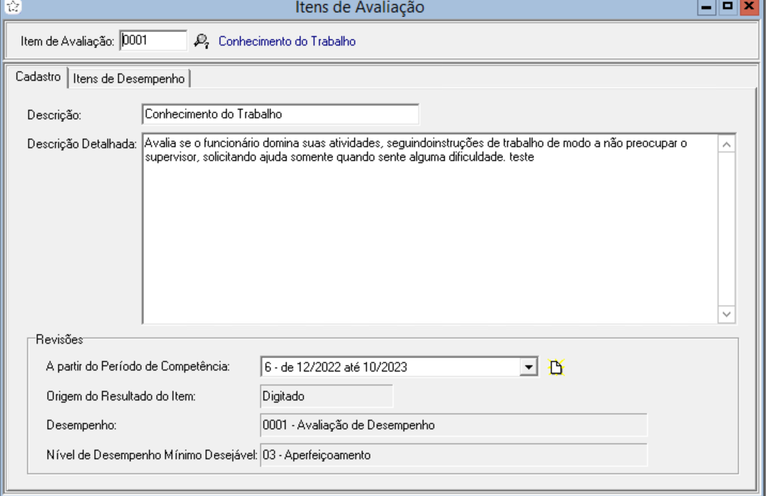 Ao cadastrar a avaliação para o colaborador, o desempenho no Item de Avaliação será gerado automaticamente.