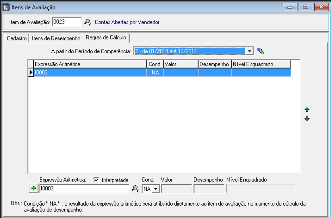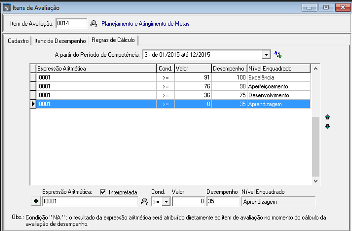 - Se usada a expressão NA na coluna Cond., o resultado da expressão aritmética é atribuído diretamente ao Item de Avaliação no momento do cálculo da avaliação, utilizando-se do valor gerado do Indicador de Resultado. Por isso, os campos Valor e Desempenho ficam desabilitados.