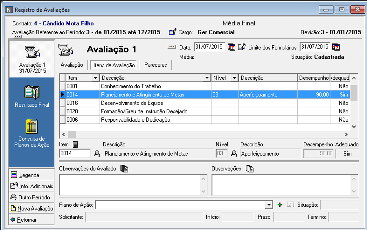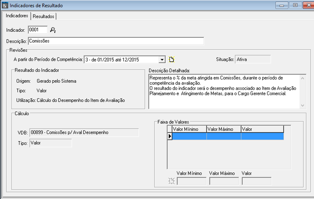 Conforme exemplo, a partir do período 3 (de 01/2015 até 12/2015) todas as avaliações que possuem o Item de Avaliação 0014 – Planejamento e Atingimento de Metas terão seu desempenho calculado pelo sistema, a partir do valor do VDB 00899 – Comissões p/Aval Desempenho.