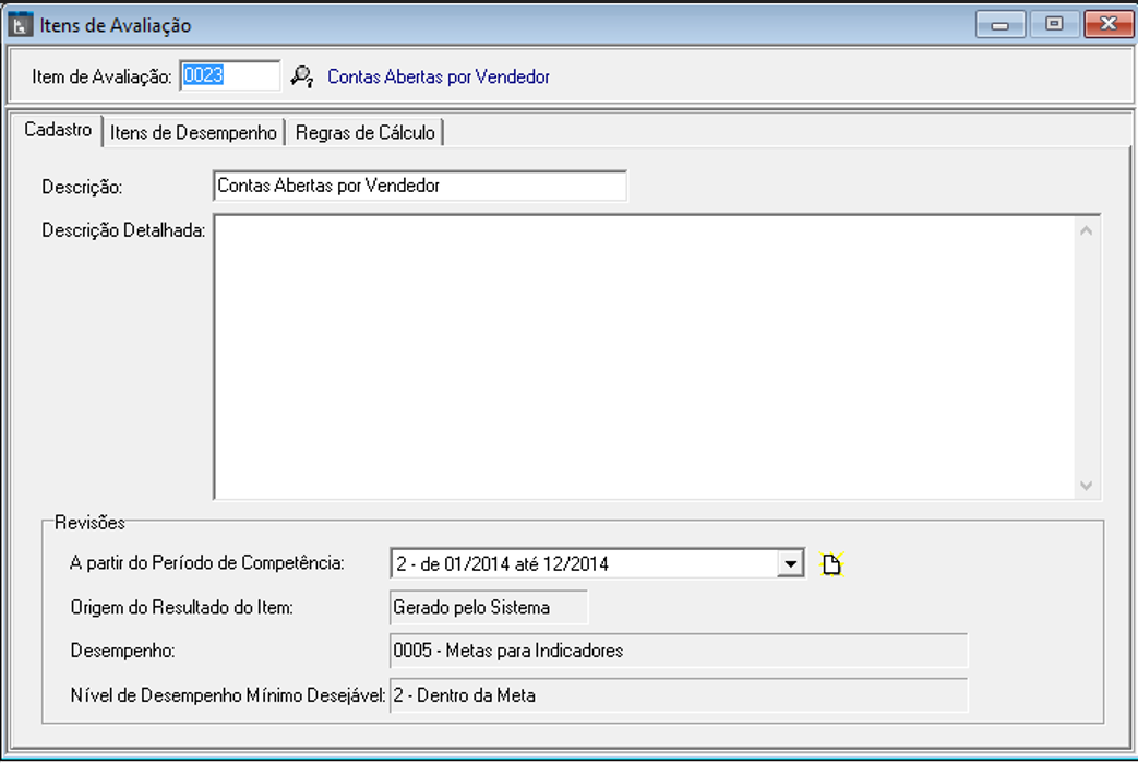 Quando o indicador é utilizado para o cálculo do desempenho de um Item de Avaliação, cria-se este item e sua regra de cálculo.