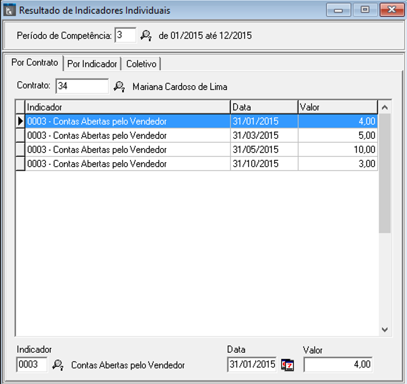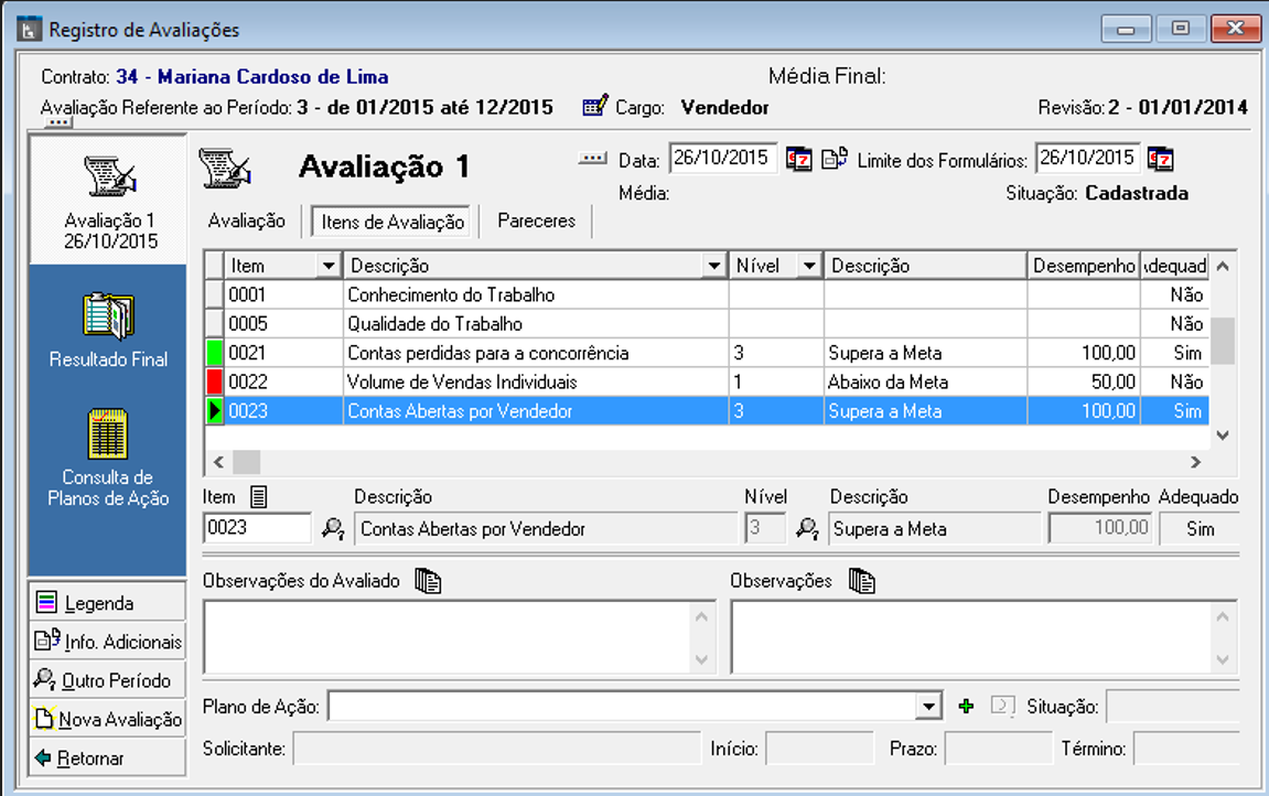 Observe o desempenho registrado no Item de Avaliação 0023- Contas Abertas por Vendedor em 100,00 – Supera a Meta é obtido a partir do valor informado individualmente para o colaborador no período e a parametrização do cálculo deste indicador: