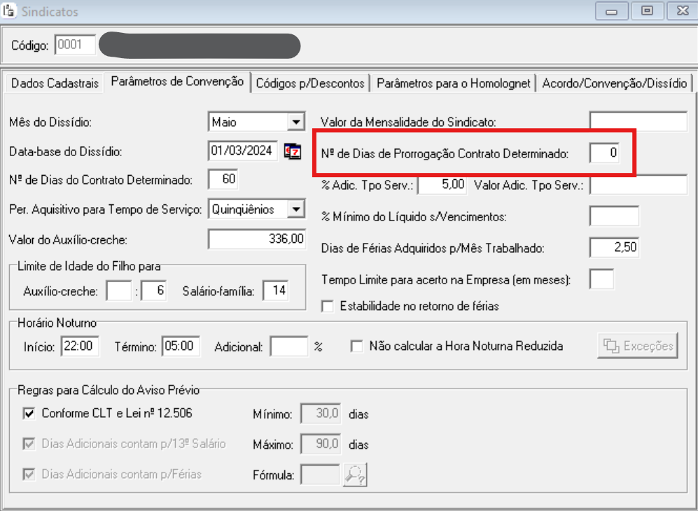 4. Selecione o respectivo sindicato e na opção N° de dias de Prorrogação Contrato Determinado altere para 0.