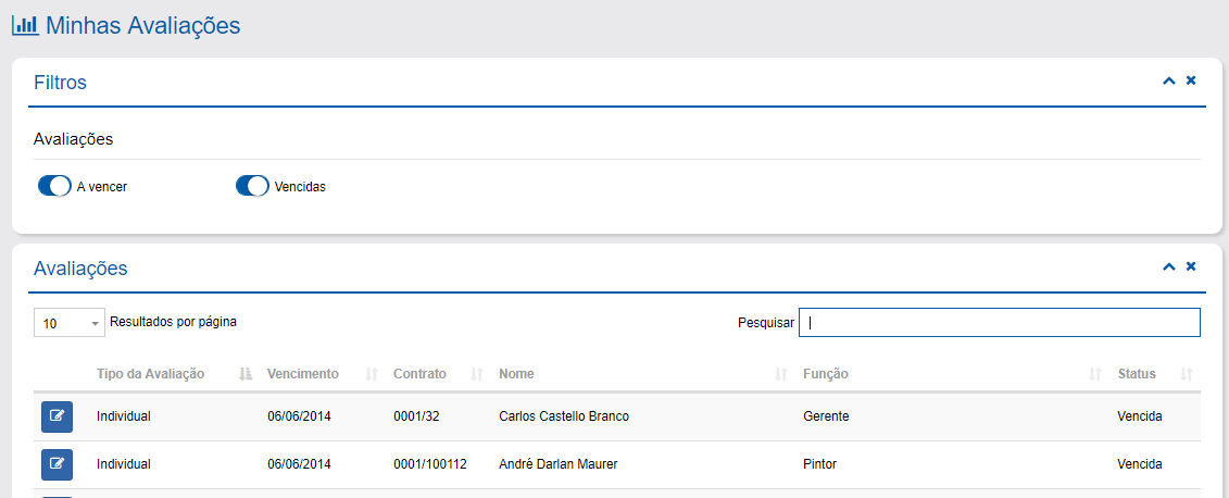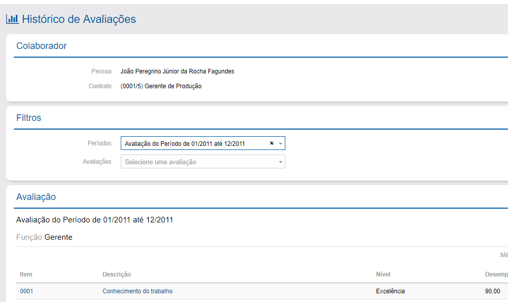 Visualização de todas as avaliações finalizadas dos colaboradores. |