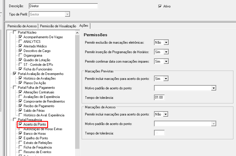 2. Ainda no Módulo Administração do Sistema, acesse o menu Perfis de Usuários e selecione o perfil desejado. Na Guia Ações, habilite a ação Acerto do Ponto.