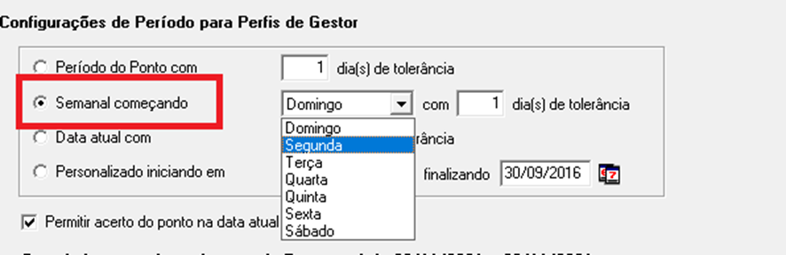 - Semanal Começando: é determinado a partir de qual dia da semana irá ser permito o ajuste do ponto e a com um aumento de datas caso a tolerância for estipulada.