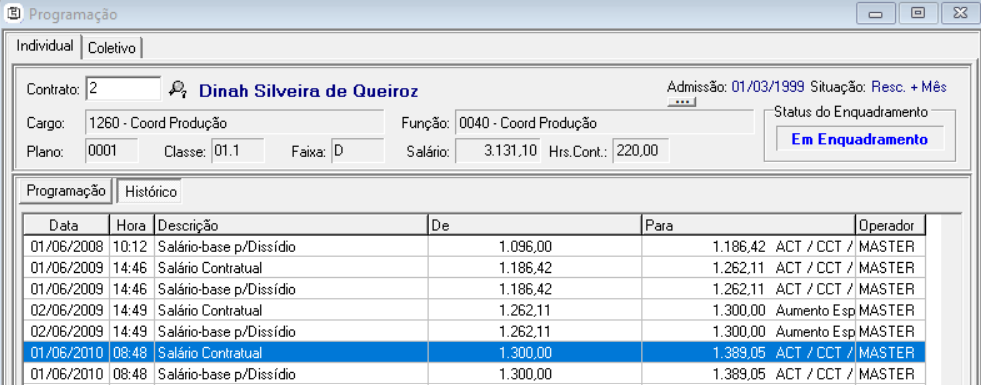 Ainda na guia Histórico, da tela da programação, é possível consultar todas as alterações de salários e lotação registradas para o colaborador.