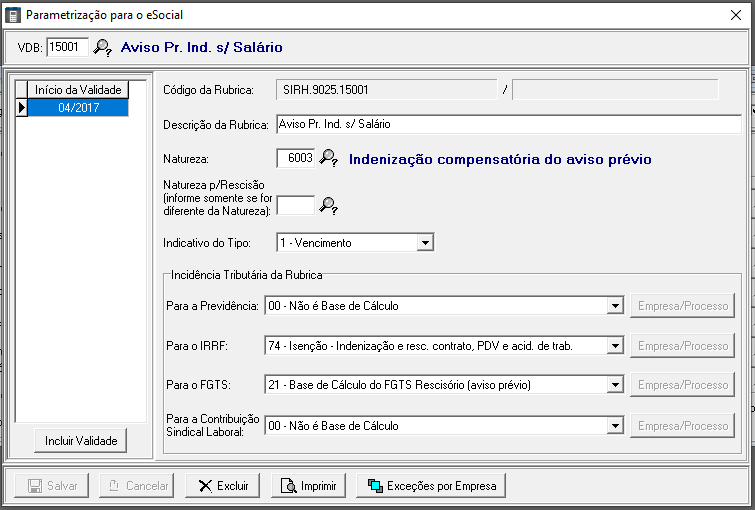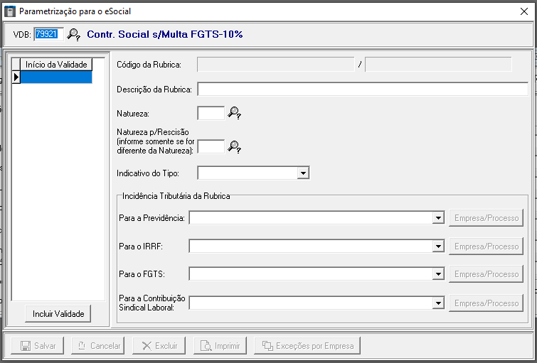 A Contr.Social s/Fgts 10% não pode estar parametrizado para o eSocial, porém alguns clientes parametrizaram na rubrica “9908” e deve ser alterado para a rubrica “9989”, pois não pode ser excluído.