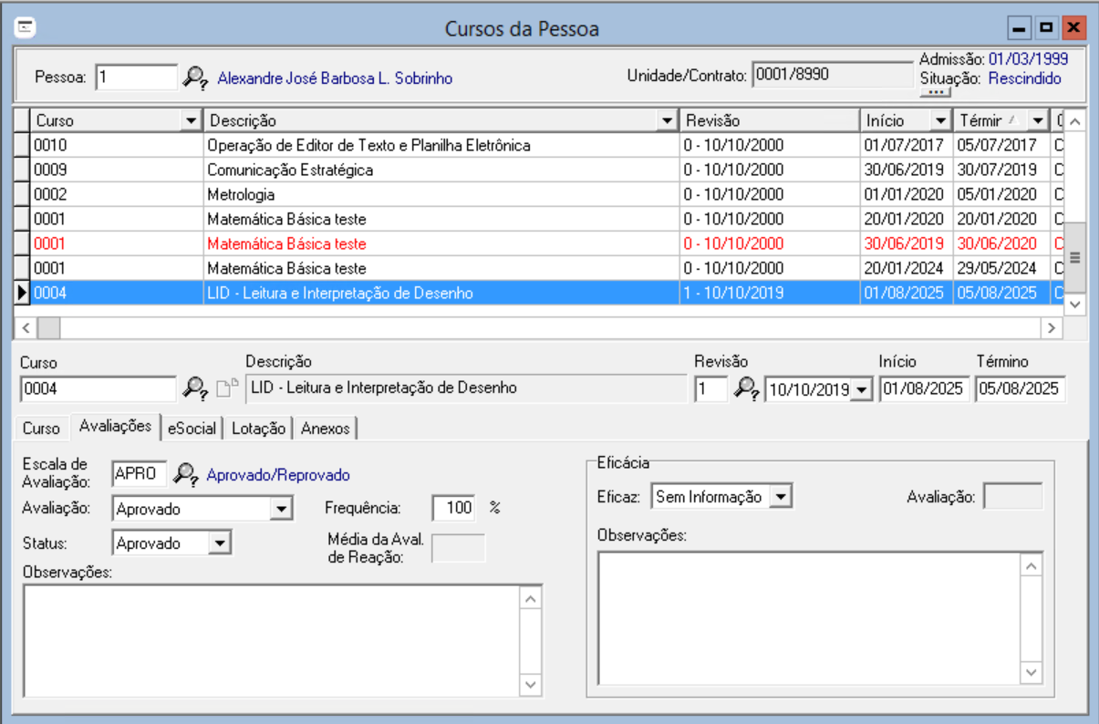 Não registre treinamentos realizados pela empresa nesta tela. Esses dados devem ser lançados no módulo específico, pois a tela de Cursos da Pessoa não contempla todas as informações necessárias para estatísticas e indicadores de treinamento.
