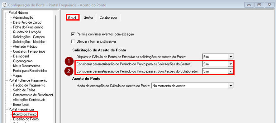 1.1.2) Selecione a opção: Permitir acerto na data atual, conforme tela abaixo. Desta forma, as solicitações com data do período anterior poderão ser executadas na data atual.