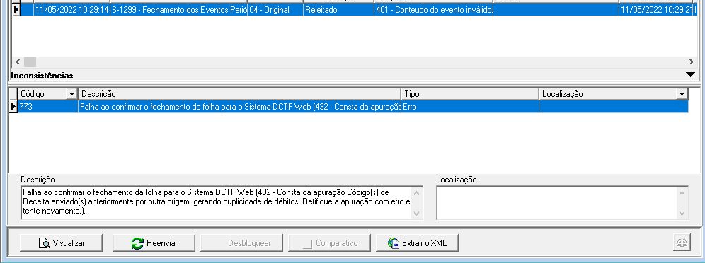 Para o erro : "Falha ao confirmar o fechamento da folha para o Sistema DCTFWeb (432- Consta da apuração Código(s) de Receita enviado(s) anteriormente por outra origem, gerando duplicidade de débitos. Retifique a apuração com erro e tente novamente). - Evento: 1299 - Fechamento dos Eventos Periódicos - Situação: Rejeitado.