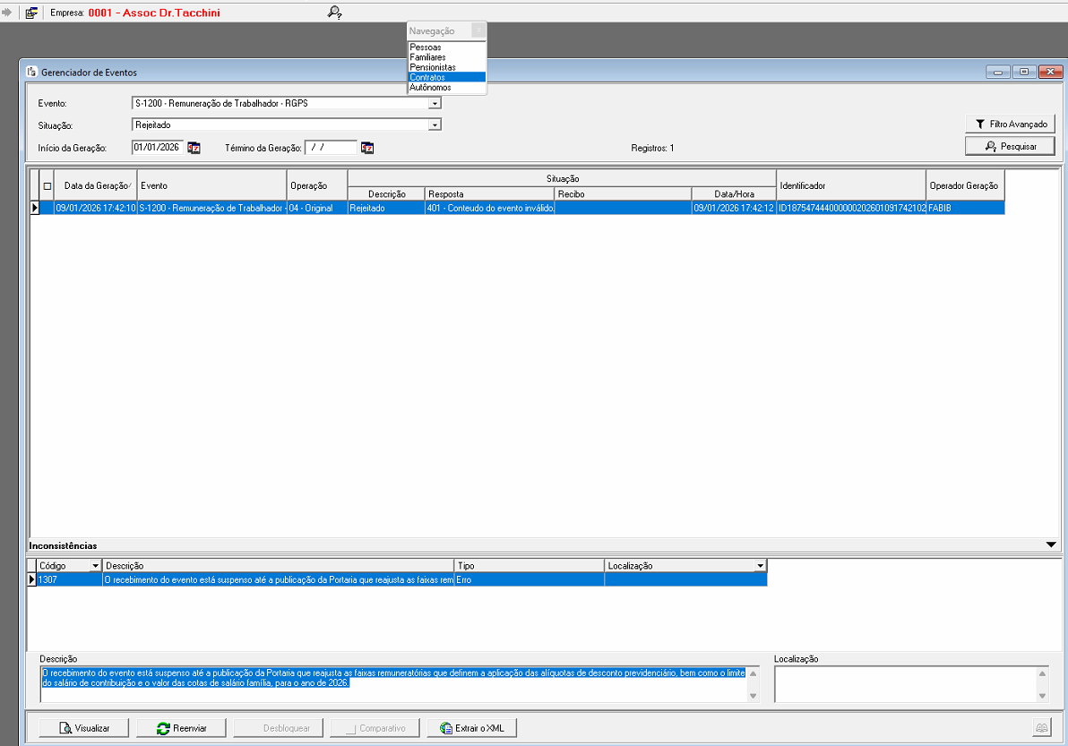 Na geração dos eventos S-2299 ou S-1200 pode ocorrer o erro 1307 "O recebimento do evento está suspenso até a publicação da Portaria que reajusta as faixas remuneratórias que definem a aplicação das alíquotas de desconto previdenciário, bem como o limite do salário de contribuição e o valor das cotas de salário família, para o ano de 2026."