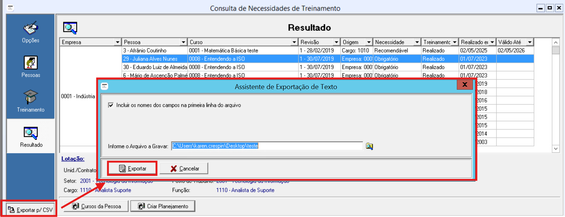 Essa consulta permite Exportar para CSV, e irá gerar o resultado conforme seleção definida.