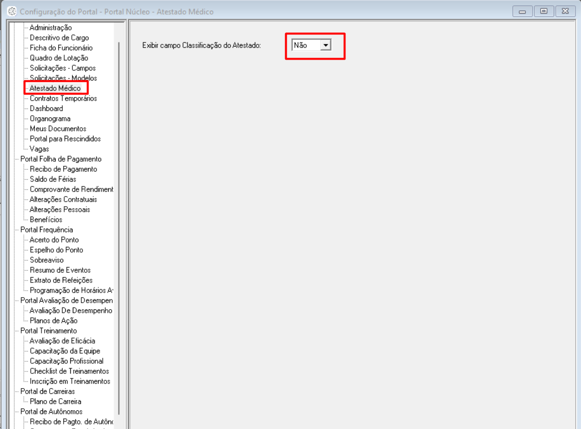 Dentro das configurações do portal, você encontrará a opção "Atestado Médico", onde poderá configurar a exibição do campo de classificação do atestado no cadastro médico. Escolha "Não".
