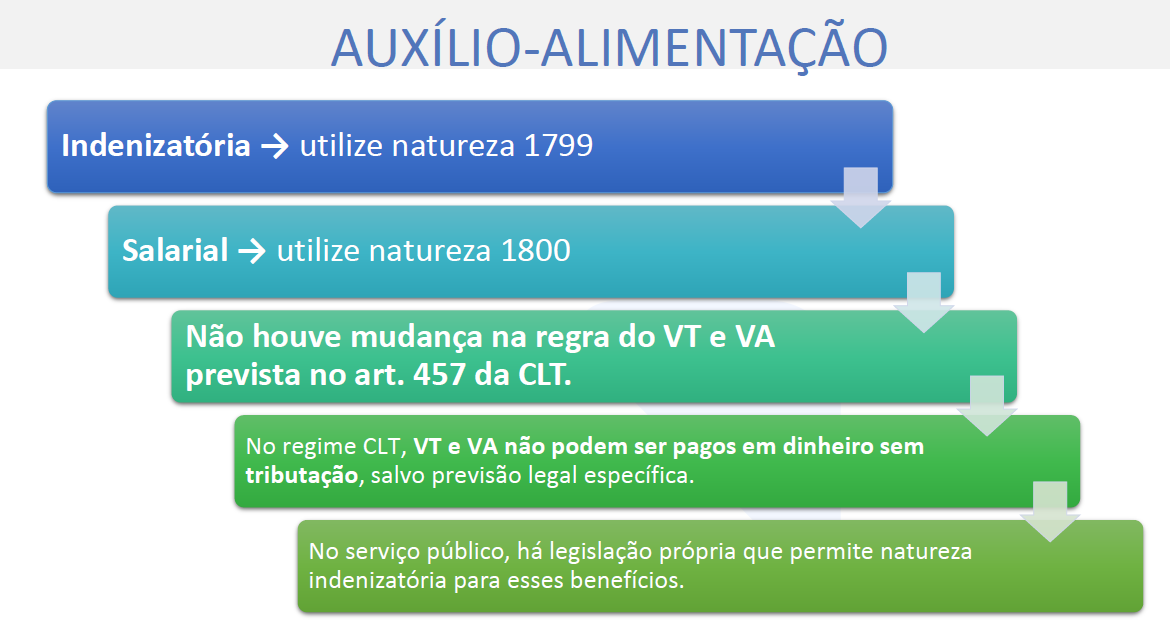 Auxílio-alimentação ou alimentação concedida sob a forma de pecúnia com natureza indenizatória por força de lei.