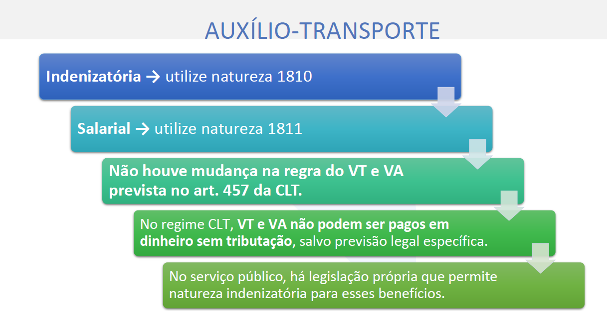 Exemplo 3: Conforme consta no manual do eSocial MOS S-1.0: Se o declarante fornece vales-transporte ao seu empregado, no valor R$ 200,00 mensais e desconta R$ 70,00 do empregado relativo a esses vales, deve informar o valor de R$ 200,00 em rubrica atrelada à natureza 1810 e R$ 70,00 em rubrica atrelada à natureza 9216.