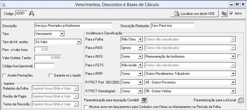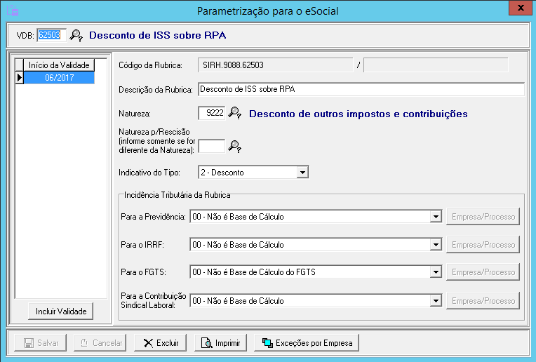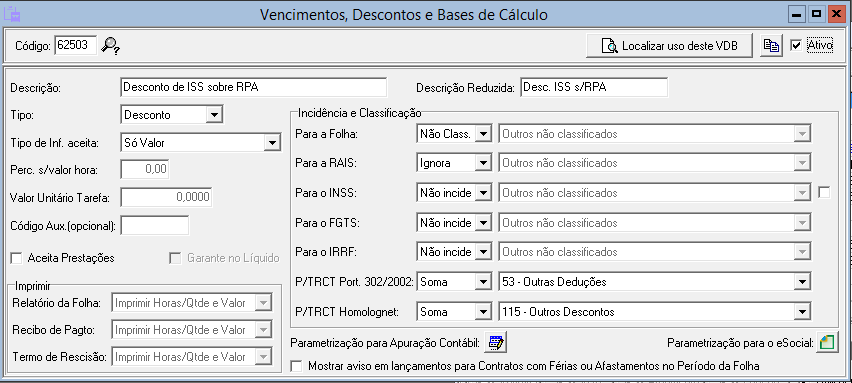 Na Folha de Pagamento, acesse o menu Arquivo > Tabelas da Folha. Crie o VDB conforme modelo.