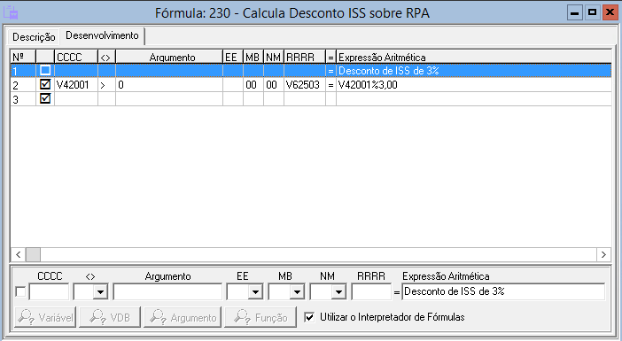 Observação: na fórmula abaixo temos o VDB 42001, porém esse VDB varia conforme base do cliente em relação ao código, o VDB deve ser como este:
