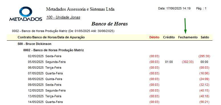 - 20/06/2025 - Adicionado no relatório de banco de horas (RHPR2070) a coluna de Fechamento, onde nela mostra o fechamento positivo ou negativo. Antes esse fechamento era somado nas colunas de crédito ou débito:
