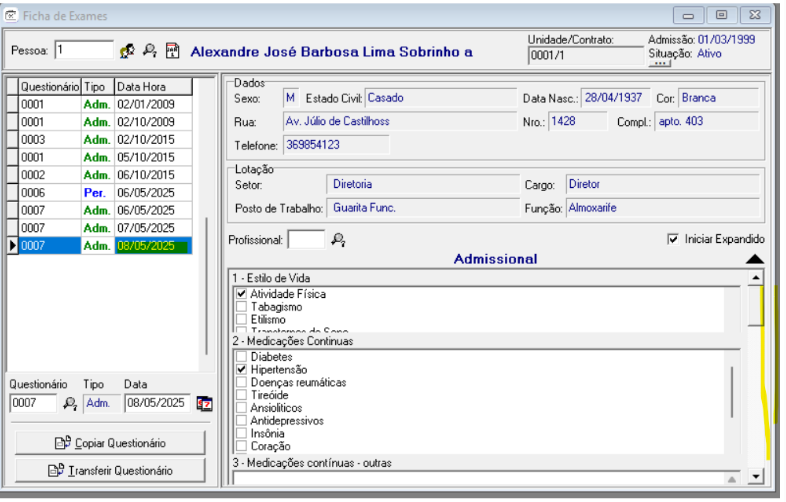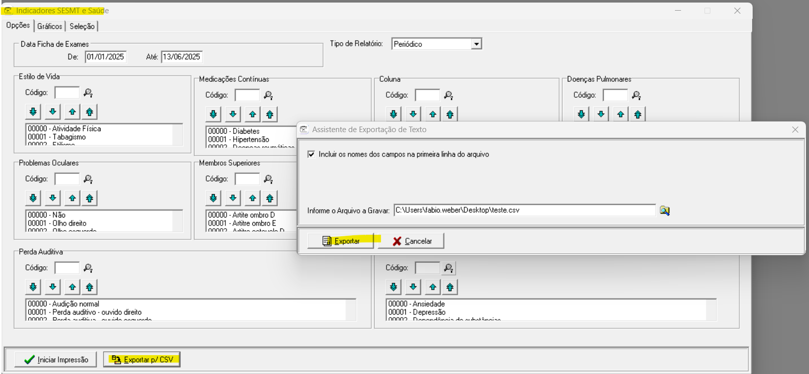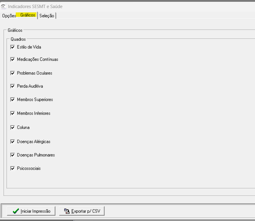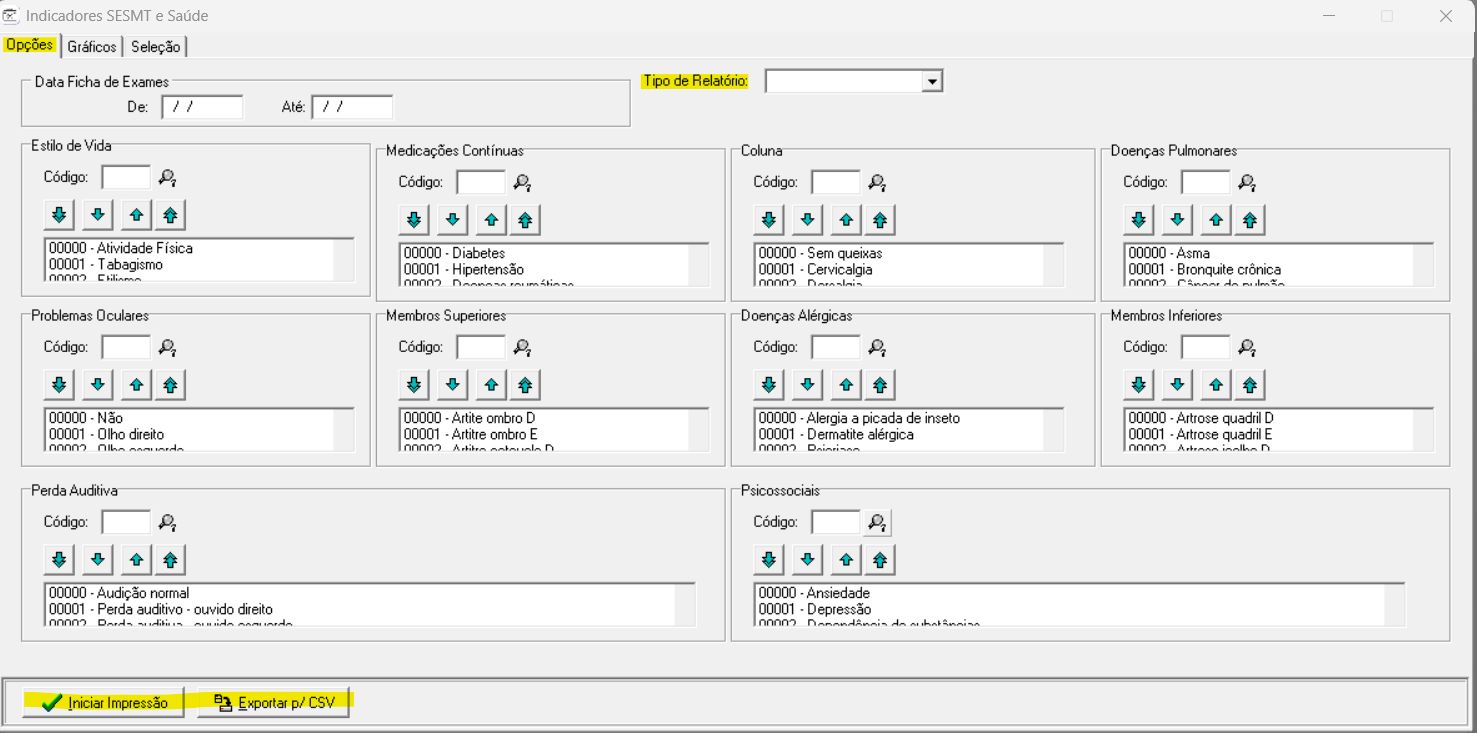 Md111845 – Indicadores SESMT e Saúde - baseados nos registros da ficha de exame do cliente conforme perguntas do questionário consulta clinica dos Formulários Admissional e Periódico