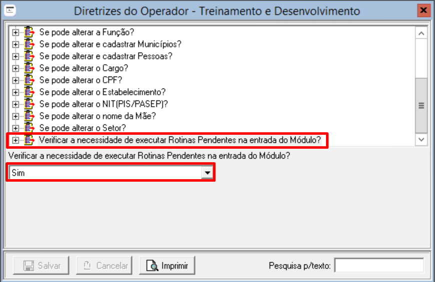 - Ainda nas Diretrizes do Operador, ative ou desative a seguinte diretriz Verificar a necessidade de executar Rotinas Pendentes na entrada do Módulo?.