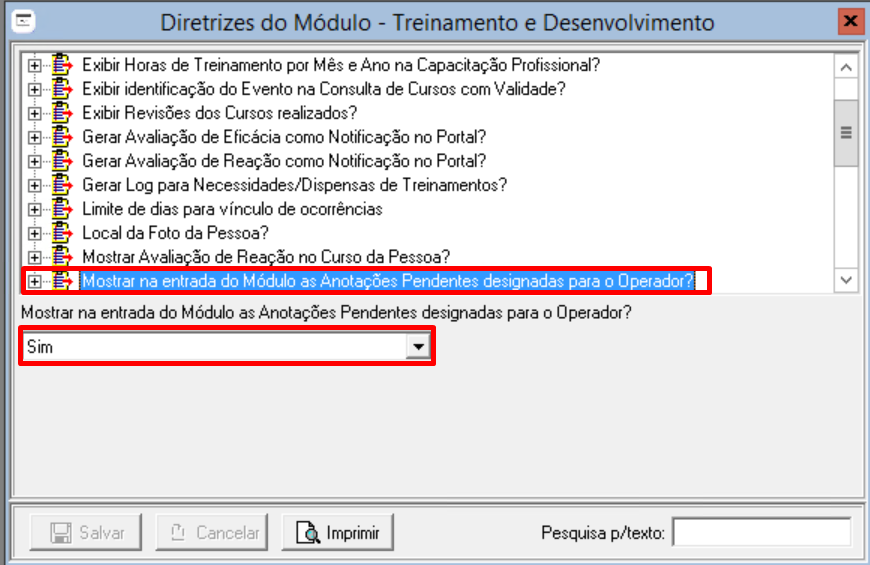 - Para exibir ou não as Anotações na entrada do módulo, localize a diretriz Mostrar na entrada do Módulo as Anotações Pendentes designadas para o Operador? e selecione opção desejada.