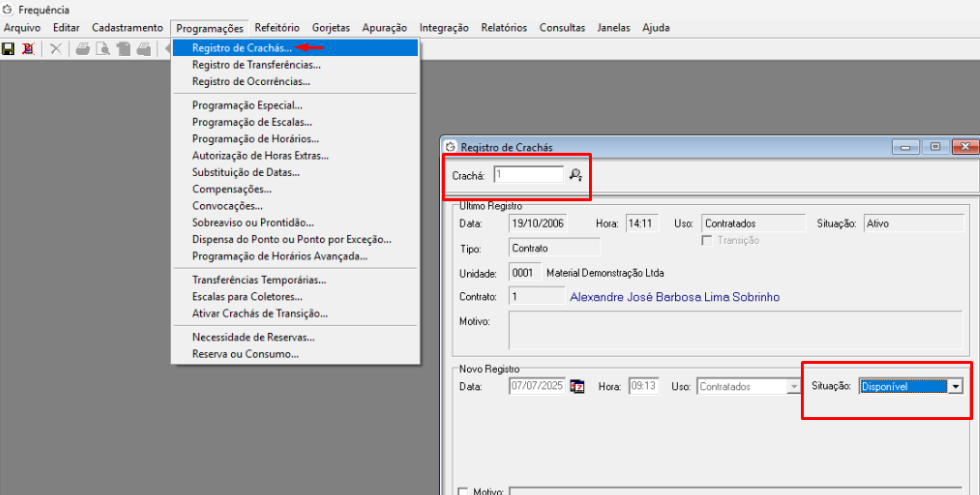 - No módulo Frequência, acesse o menu: Programações > Registro de Crachás.
