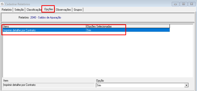 3. Na guia Opções, selecione Sim para o Item Imprimir detalhe por Contrato.