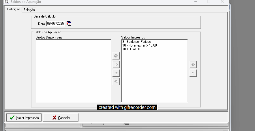 - Todos os saldos ativos estarão listados no lado direito (Saldos Impressos).