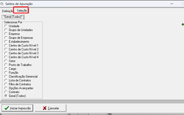 5. Na aba Seleção, é possível aplicar filtros por contratos específicos.