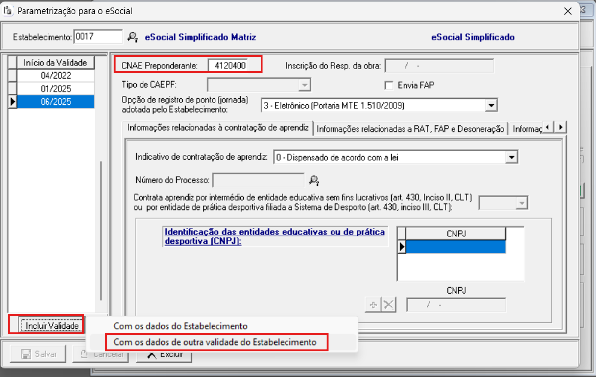 - Clique em Incluir Validade e selecione: Com os dados de outra validade do Estabelecimento.