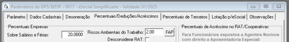 📌 Observação: a inclusão de um novo Início de Validade é sempre obrigatória quando for necessário alterar os percentuais da contribuição previdenciária, inclusive o FAP, ou outras informações referentes ao FGTS. - Ajuste o novo percentual de RAT na guia Percentuais/Deduções/Acréscimos, no campo Riscos Ambientais do Trabalho.