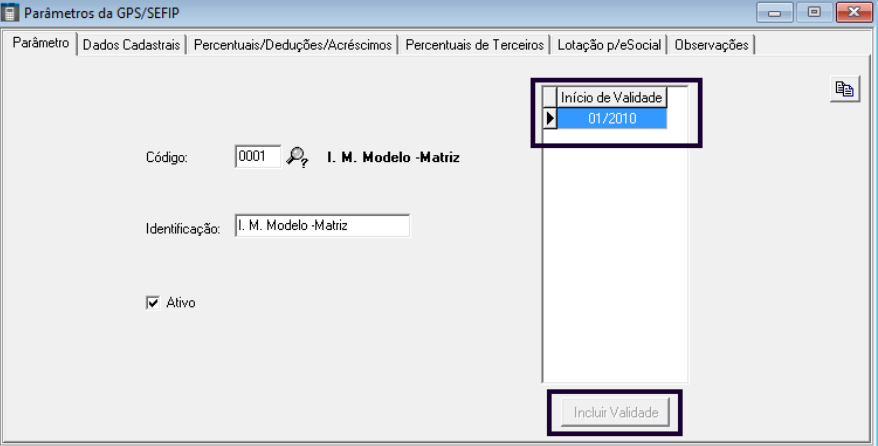 🔍 Para dúvidas, consulte o artigo: Como Cadastrar Parâmetro da GPS/SEFIP. - Clique em Incluir Validade para informar o Início de Validade.