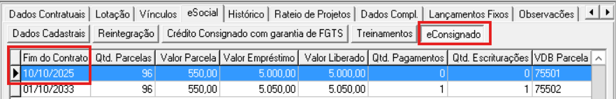Quando no menu Cadastramento > Contrato na guia eSocial/eConsignado tem contratos encerrados em competência anterior ao cálculo da folha, o Empréstimo não será considerado.