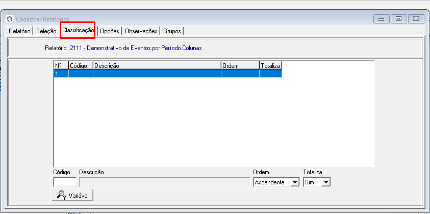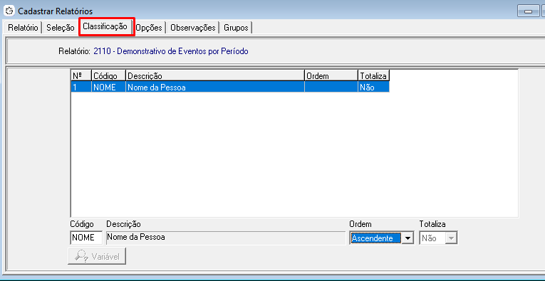 - Sem classificação: o relatório será gerado com o total por evento, sem detalhamento por colaborador.
