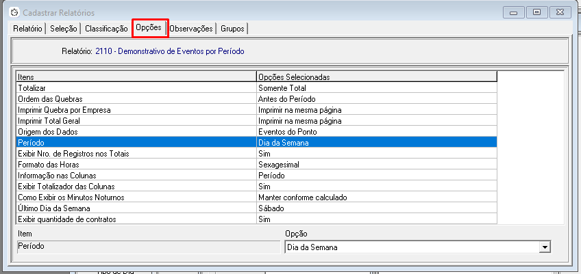 - Para o propósito de análise por dia da semana, configure o Item Período com a Opção Dia da Semana.