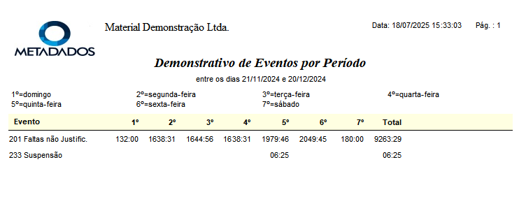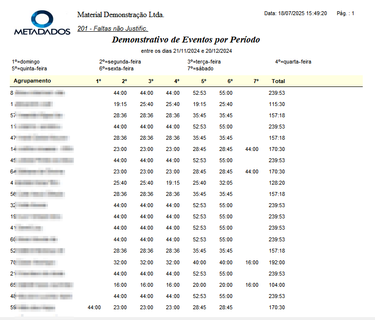 O Relatório RHPR2110 - Demonstrativo de Eventos por Período permite visualizar os eventos do ponto organizados por dia da semana. É possível observar tanto os totais por evento em cada dia quanto detalhar as ocorrências por colaborador, se desejado.