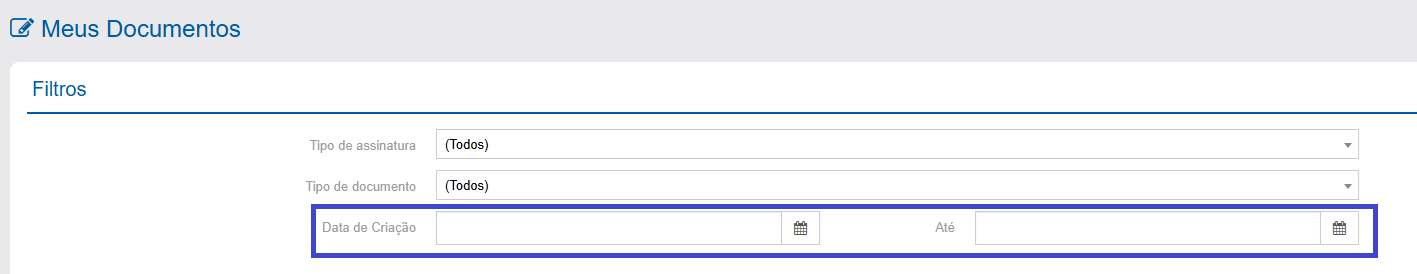 Foi disponibilizado um filtro de datas que permite consultar documentos considerando um período específico. O filtro utiliza como referência a data de criação do documento.