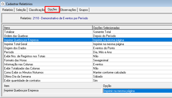 1.4.1 Na aba Opções do relatório selecionado, verifique e ajuste as configurações conforme a imagem abaixo. Certifique-se principalmente de que: