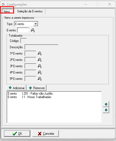 2.4 Nas Configurações, na aba Itens, inclua os eventos.