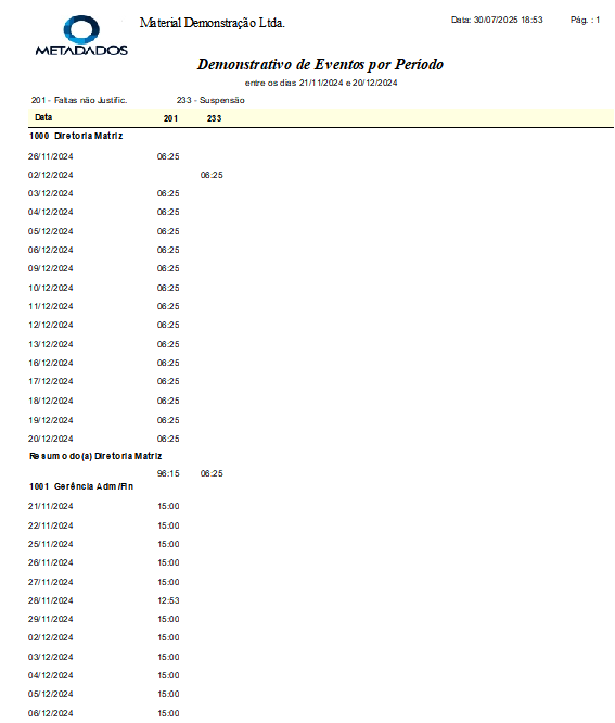 Exemplo do Relatório Demonstrativo de Eventos por Período: