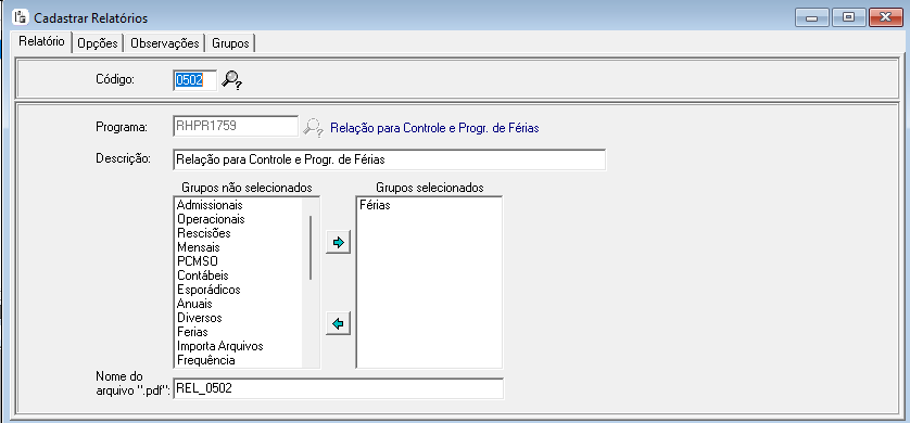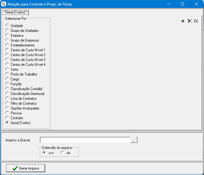 Foi desenvolvido o Programa RHPR1759 – Controle e Programação de Férias, com o objetivo de gerar uma relação para auxiliar no controle e na programação de férias dos colaboradores. O arquivo poderá ser gerado em CSV (valores separados por vírgula) e XLS (planilha Excel). Para utilização, realizar o cadastro do programa no sistema e após emitir o relatório conforme necessidade.
