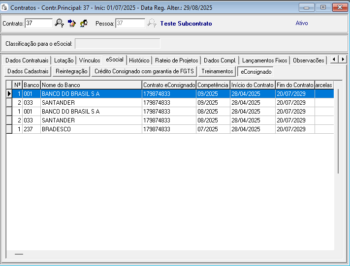 Foi realizada a inclusão da coluna "Nome do Banco" nas guias relacionadas ao eConsignado, presentes tanto no processo de Cadastramento de Contratos quanto na Ficha Financeira. Essa melhoria tem como objetivo tornar mais acessível e visível a informação bancária associada aos contratos consignados diretamente na interface de consulta.