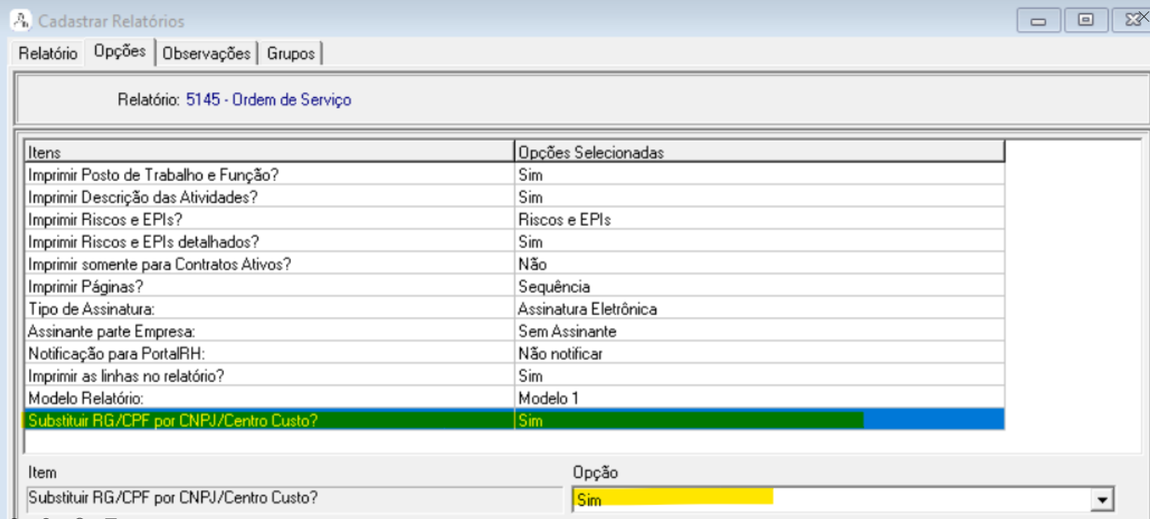 MD115704 - Customizar relatório de O.S. - Nova opção no relatório: <Substituir RG/CPF por CNPJ/Centro Custo> e incluir siglas de trabalho em altura e espaço confinado das funções.