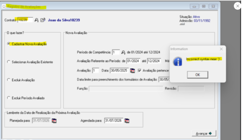 --> 1) erro ao cadastrar avaliação Avaliação --> registro de avaliações e cadastramento coletivo --> AD - Incorrect syntax near - clientes Oracle