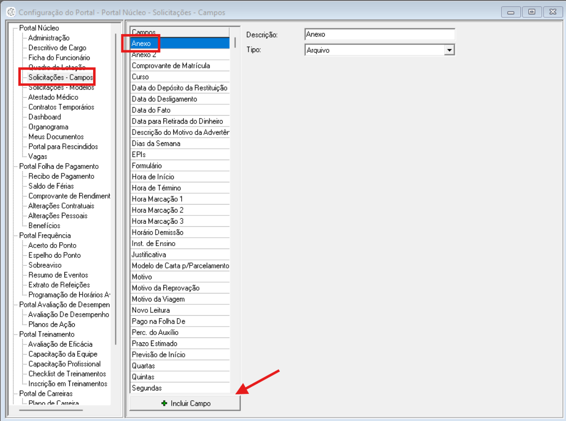 1.2 Clique em Solicitações - Campos e selecione o Campo Anexo.