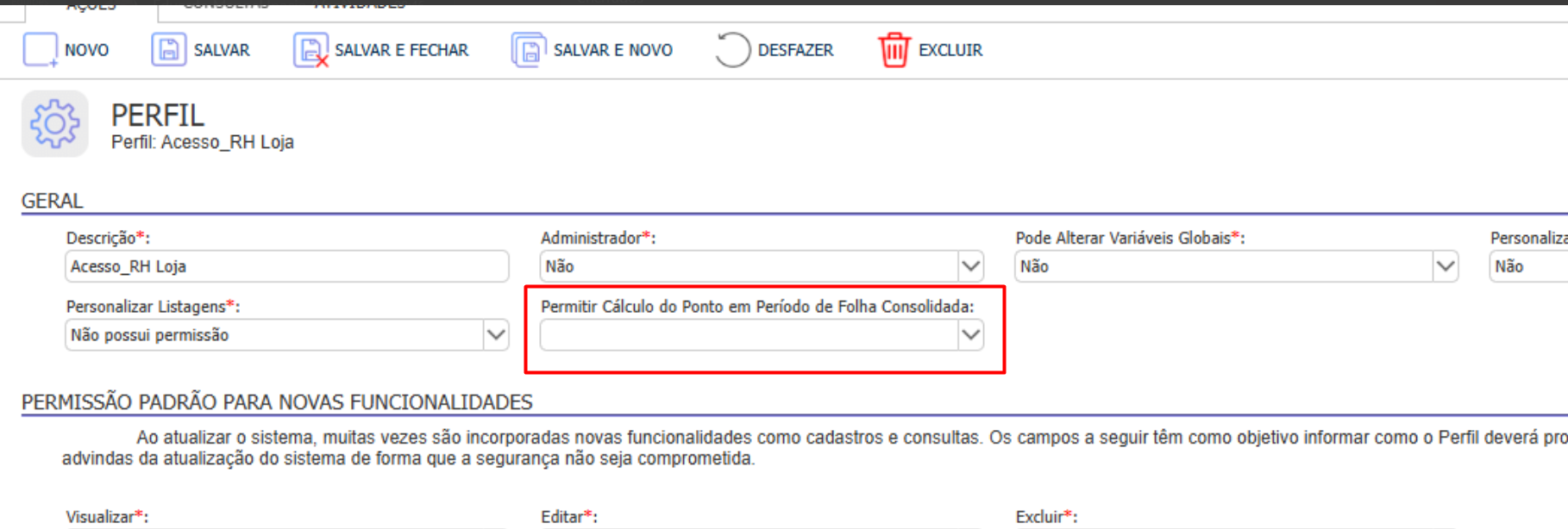 No cadastro de Perfil do Usuário, existe o campo Permitir Cálculo do Ponto em Período de Folha Consolidada, que deve estar configurado como Sim ou Não. Se não houver seleção, o sistema impede o cálculo.
