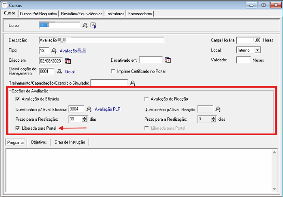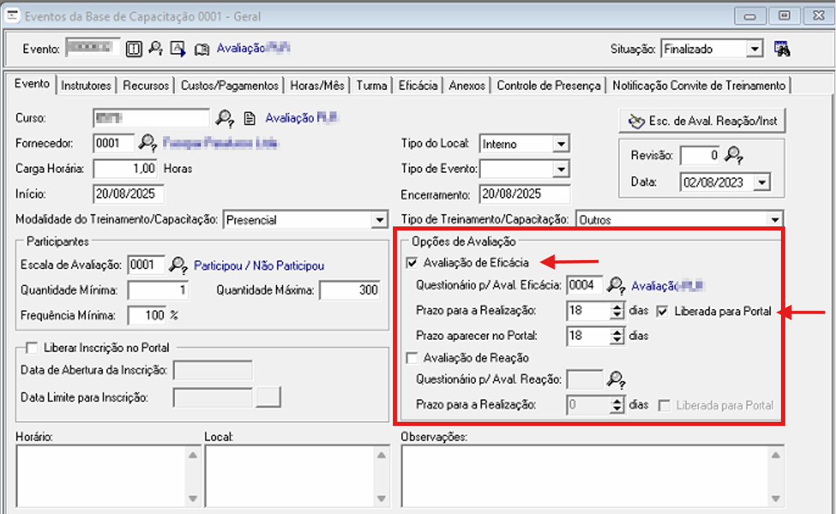 2° Verificar Cadastro do Evento e Curso, se estão parametrizados corretamente para levar a informação para o Portal RH: