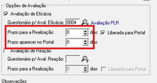 Os campos PRAZO PARA REALIZAÇÃO e PRAZO APARECER NO PORTAL devem ficar ZERADOS:
